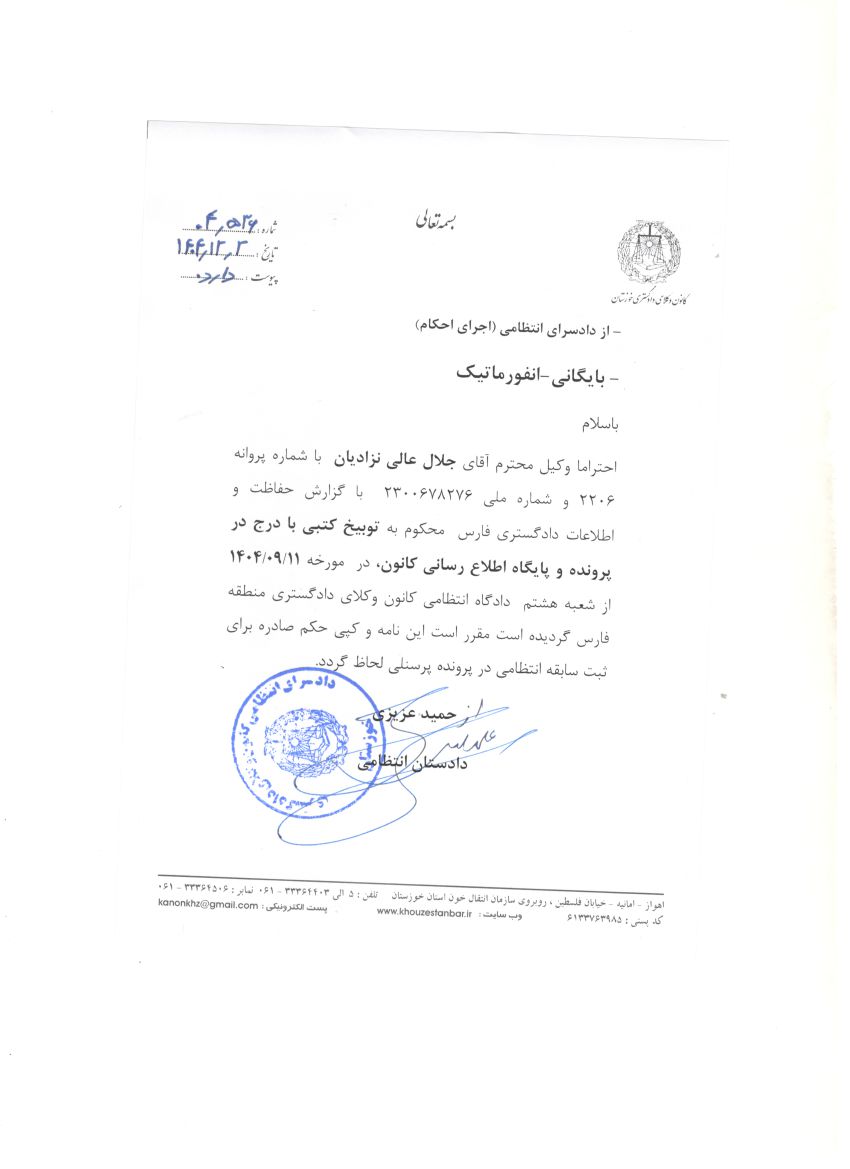 اخبار تصویری برگزاری دوازدهمین دوره انتخابات هیات مدیره ۱۴۰۴/۰۸/۰۲ اخبار تصویری گزارش تصویری آیین تحلیف کارآموزان ورودی سال ۱۴۰۰ ۱۴۰۳/۱۱/۲۴ اخبار تصویری اخبار و اطلاعیه های کمیسیون کارآموزی برگزاری آزمون ورودی کارآموزی وکالت سال ۱۴۰۳ ۱۴۰۳/۰۸/۱۷ اخبار تصویری اخبار و اطلاعیه های کمیسیون کارآموزی دیدار اعضای هیات مدیره و ارکان کانون با دادستان مرکز استان خوزستان ۱۴۰۳/۰۸/۰۳ اخبار تصویری جلسه آموزشی و توجیهی تیم اعزامی به المپیاد ورزشی کانون های وکلای کشور ۱۴۰۳/۰۷/۱۶ اخبار تصویری اخبار و اطلاعیه های کمیسیون ورزش اطلاعیه های کانون ساعت کار ادارات خوزستان در ماه رمضان ۹ صبح الی ۱۴ مشخص شد ۱۴۰۴/۱۱/۳۰ اطلاعیه – نامه معاونت فناوری اطلاعات و برنامه ریزی دادگستری استان درمورد اختلال سامانه عدل ایران ۱۴۰۴/۱۱/۱۴ اطلاعیه شماره هفت – اعلام زمان مراجعه به پزشکی قانونی پذیرفته شدگان آزمون صدور پروانه کارآموزی وکالت سال ۱۴۰۴ در سهمیه آزاد و ایثارگر ۱۴۰۴/۱۱/۰۱ اطلاعیه شماره شش – اعلام گروه ایتا جهت هماهنگی ثبت نام پذیرفته شدگان آزمون صدور پروانه کارآموزی وکالت سال ۱۴۰۴ در سهمیه آزاد و ایثارگر ۱۴۰۴/۱۰/۳۰ اطلاعیه شماره پنج – اعلام لینک ثبت نام پذیرفته شدگان آزمون صدور پروانه کارآموزی وکالت سال ۱۴۰۴ در سهمیه آزاد و ایثارگر ۱۴۰۴/۱۰/۲۸ اخبار کانون هفتم اسفندماه سالروز استقلال کانون وکلای دادگستری و روز وکیل مدافع بر تمامی مدافعان حق و عدالت گرامی باد ۱۴۰۴/۱۲/۰۶ انتخابات هیئت رئیسه دوره دوازدهم هیئت مدیره کانون وکلای دادگستری خوزستان ۱۴۰۴/۰۸/۲۰ اطلاعیه اعلام زمان پرینت کارت و برگزاری آزمون پذیرش متقاضیان پروانه کارآموزی وکالت کانونهای وکلای دادگستری جمهوری اسلامی ایران سال ۱۴۰۴ ۱۴۰۴/۰۸/۱۱ نامه مرکز آمار و فناوری قوه قضاییه در مورد اشکالات مالیاتی در سامانه عدل ایران ۱۴۰۴/۰۶/۰۴ رحلت جانسوز امام خمینی(ره) تسلیت باد ۱۴۰۴/۰۳/۱۴ ورود به سامانه اتوماسیون اداری وکلا و مراجعین هیات نظارت بر انتخابات هیات مدیره پیام تقدیر و تشکر رئیس هیات نظارت بر دوازدهمین دوره انتخابات هیات مدیره کانون وکلای دادگستری استان خوزستان ۱۴۰۴/۰۸/۱۲ اعلام نتایج قطعی دوازدهمین دوره انتخابات هیات مدیره کانون وکلای دادگستری استان خوزستان ۱۴۰۴/۰۸/۱۲ نتیجه رسیدگی به اعتراض دو نفر از وکلا به دوازدهمین دوره انتخابات هیات مدیره کانون وکلای دادگستری خوزستان ۱۴۰۴/۰۸/۰۷ نتیجه رسیدگی به اعتراض دو نفر از وکلا به دوازدهمین دوره انتخابات هیات مدیره کانون وکلای دادگستری خوزستان ۱۴۰۴/۰۸/۰۶ پیام قدردانی رئیس هیأت نظارت از اعضای هیأت نظارت و اجرایی دوازدهمین دوره انتخابات کانون وکلای خوزستان ۱۴۰۴/۰۸/۰۱ اعلام نتیجه و شمارش آرای دوازدهمین دوره انتخابات هیات مدیره کانون وکلای دادگستری استان خوزستان ۱۴۰۴/۰۸/۰۱ اخبار کمیسیون ها نامه دبیر اجرایی هشتمین المپیاد ورزشی وکلا ۱۴۰۴/۰۸/۱۳ تاریخ آیین قرعه کشی هشتمین المپیاد ورزشی در اسکودا ۱۴۰۴/۰۸/۰۶ مراحل تمدید پروانه ۱۴۰۴/۰۸/۰۵ اصلاحیه اطلاعیه هشتمین المپیاد ورزشی ۱۴۰۴/۰۷/۲۰ اصلاحیه اطلاعیه ثبت نام هشتمین المپیاد ورزشی ۱۴۰۴/۰۷/۱۵ هفتمین المپیاد ورزشی کانون های وکلای دادگستری ایران در یک نگاه ۱۴۰۳/۰۸/۰۳ کارگاه آموزشی فن بیان و سخنوری در وکالت ۱۴۰۳/۰۸/۰۳ ثبت نام اولیه پذیرفته شدگان آزمون کارآموزی وکالت سال ۱۴۰۲ ۱۴۰۲/۰۷/۲۹ فراخوان ها همکار محترم اگر از خانواده معظم شهدا یا دارای جانبازی یا آزاده و یا ایثارگری و یا دارای ناشنوا یی یا نابینایی به هر میزان می باشید طی لایحه ای به کانون اعلام نمایید . ۱۴۰۴/۰۸/۱۳ جشنواره ملی قلم وکیل به میزبانی کانون وکلای دادگستری استان بوشهر ۱۴۰۴/۰۸/۰۹ نشست هم اندیشی تاثیر معرفی خدمات فراصنفی وکلا و کانون وکلا به شهروندان ۱۴۰۴/۰۷/۳۰ فراخوان ارایه پیشنهادات جهت اصلاح آیین نامه اجرایی لایحه استقلال کانون های وکلای دادگستری ۱۴۰۴/۰۶/۱۱ اطلاعیه ثبت نام یازد