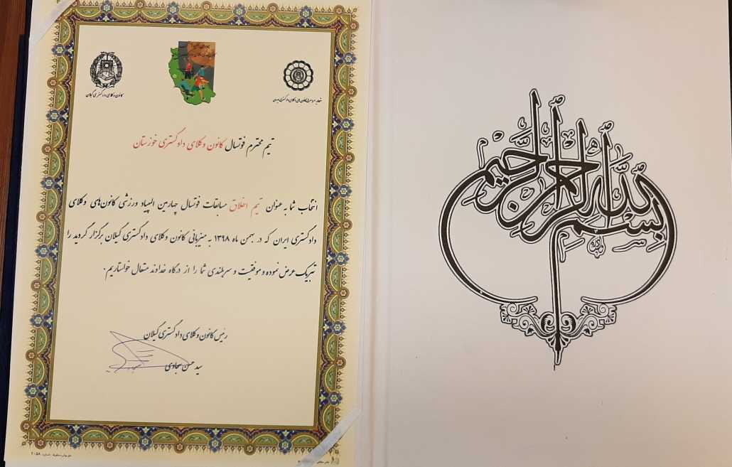 به گزارش روابط عمومی کانون وکلای دادگستری خوزستان، تیم فوتسال کانون خوزستان که در چهارمین دوره المپیاد ورزشی کانون های وکلای داگستری در گیلان حضور داشت به عنوان تیم اخلاق این مسابقات برگزیده شد. همچنین فرید حداد بازیکن این تیم به عنوان بهترین گلزن، جایزه آقای گلی مسابقات را کسب کرد. کانون وکلای دادگستری خوزستان این موفقیتها رو حضور اعضای تیم فوتسال کانون تبریک عرض میکند.