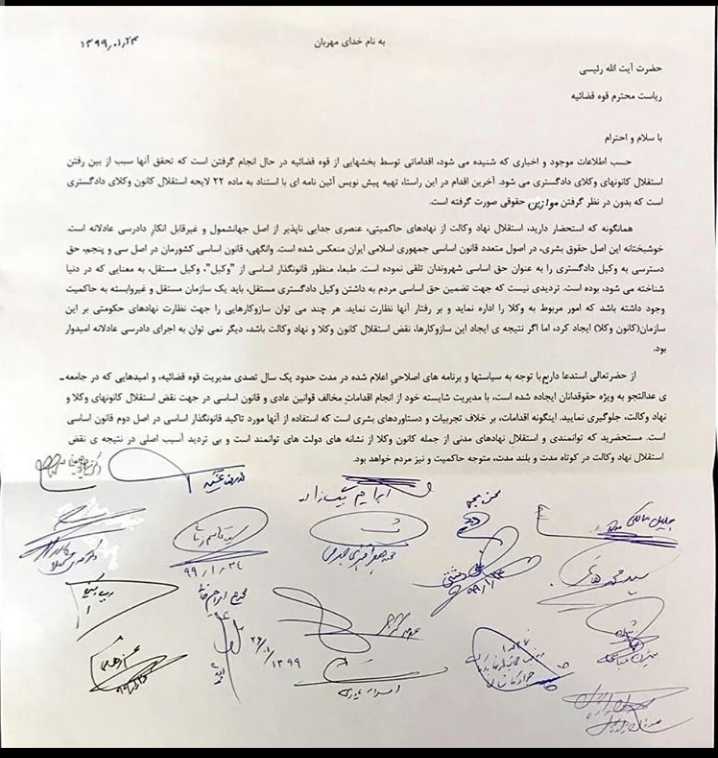از حضرتعالی استدعا داریم با توجه به سیاستها و برنامه های اصلاحیِ اعلام شده در مدت حدود یک سال تصدی مدیریت قوه قضائیه، و امیدهایی که در جامعه ی عدالتجو به ویژه حقوقدانان ایجاده شده است، با مدیریت شایسته خود از انجام اقداماتِ مخالف قوانین عادی و قانون اساسی در جهت نقض استقلال کانونهای وکلا و نهاد وکالت، جلوگیری نمایید. اینگونه اقدامات، بر خلاف تجربیات و دستاوردهای بشری است که استفاده از آنها مورد تاکید قانونگذار اساسی در اصل دوم قانون اساسی است.