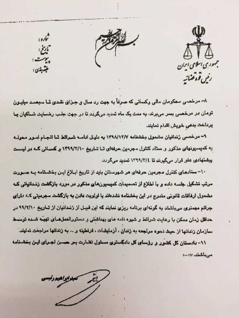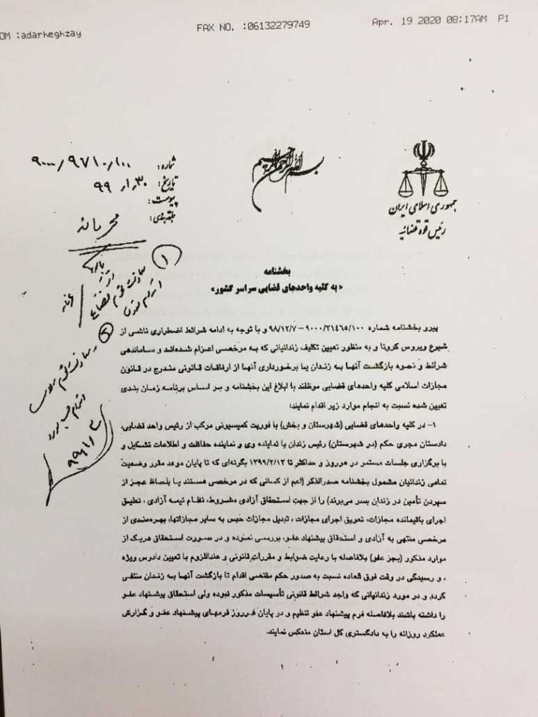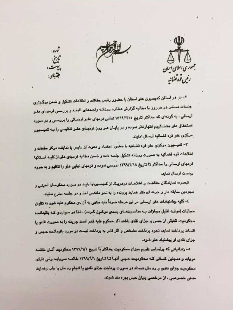 دستهبندی نشده بخشنامه جدید رییس قوه قضاییه در خصوص تعیین تکلیف زندانیان با توجه به شرایط بیماری کرونا منتشر شده در کانون وکلای دادگستری استان خوزستان ۱۳۹۹/۰۲/۰۵ فعال ۱۳۹۹/۰۲/۰۵ ۰