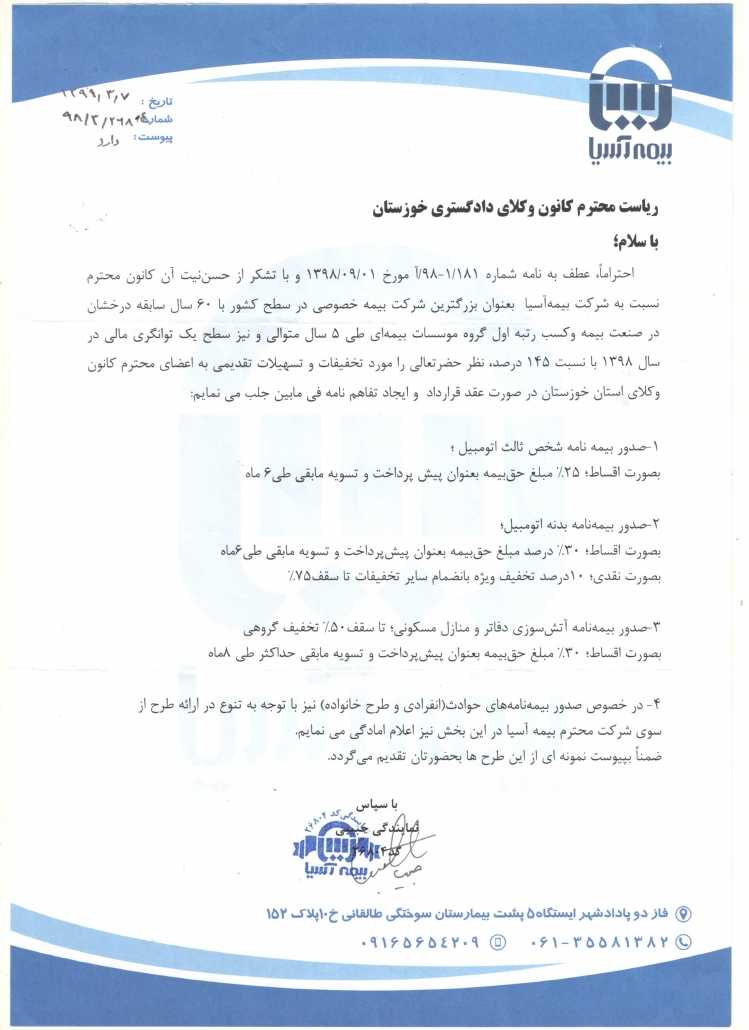دستهبندی نشده انعقاد تفاهم نامه فی ما بین کانون وکلای دادگستری خوزستان با بیمه آسیا منتشر شده در کانون وکلای دادگستری استان خوزستان ۱۳۹۹/۰۳/۲۴ فعال ۱۳۹۹/۰۳/۲۴ ۰