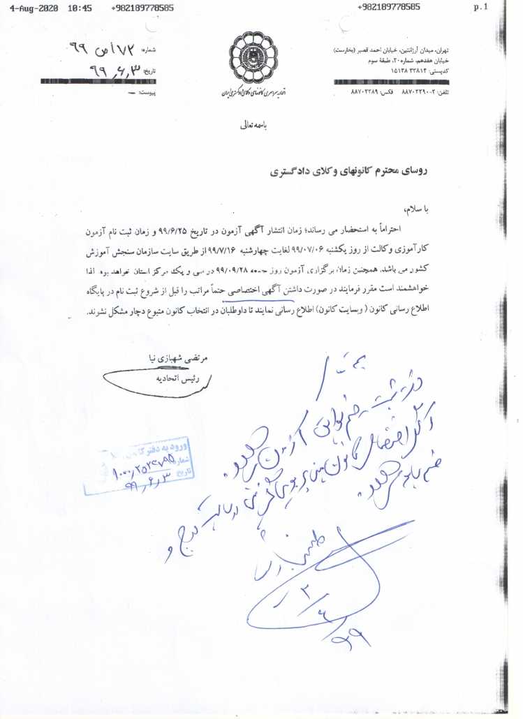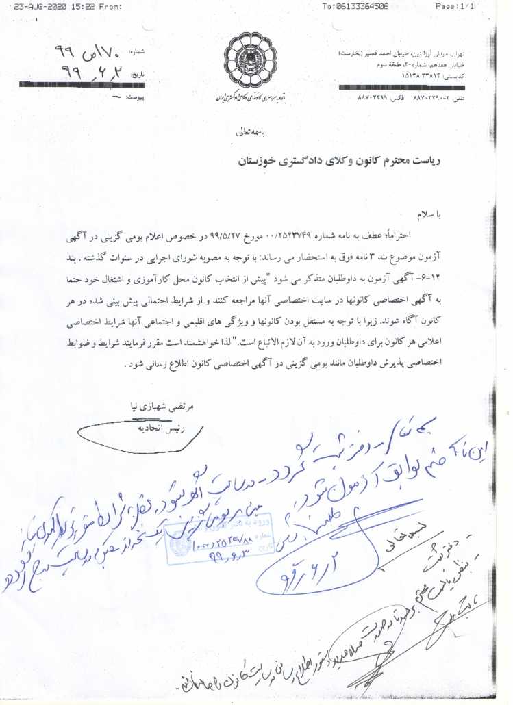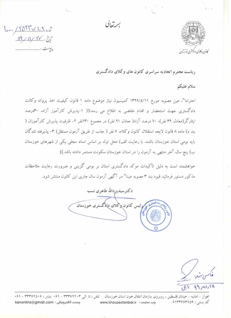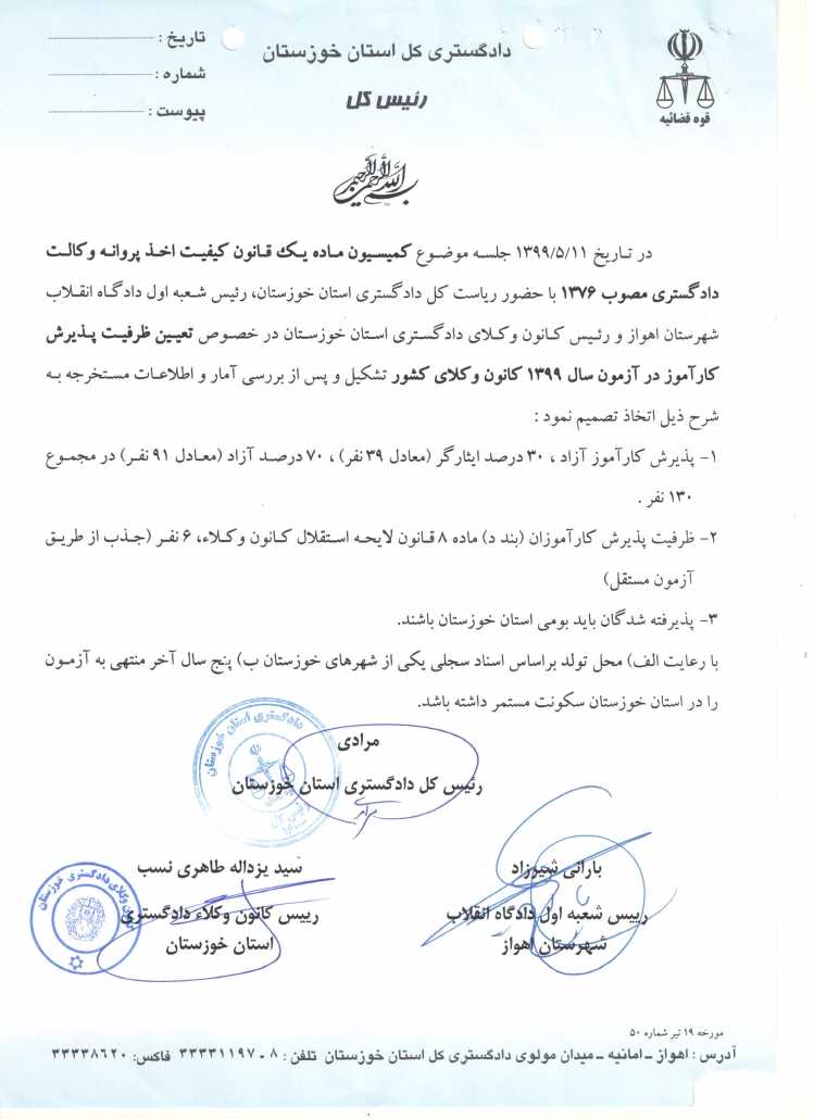 ظرفیت کانون وکلای دادگستری خوزستان جهت آزمون کارآموزی وکالت سال ۱۳۹۹ با قید پذیرش صرفا کارآموزان بومی استان خوزستان، تعداد ۱۳۰ نفر تعیین گردید.