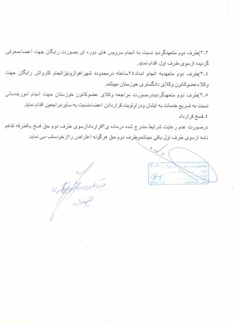 نمایندگی مجاز هیوندای به نشانی کوی سید خلف بعد از نمایشگاه بینالمللی بلوار اروند پلاک ۴۹ در راستای اجرای این تفاهم نامه آماده ارائه خدمات به وکلای عضو کانون خوزستان میباشد.