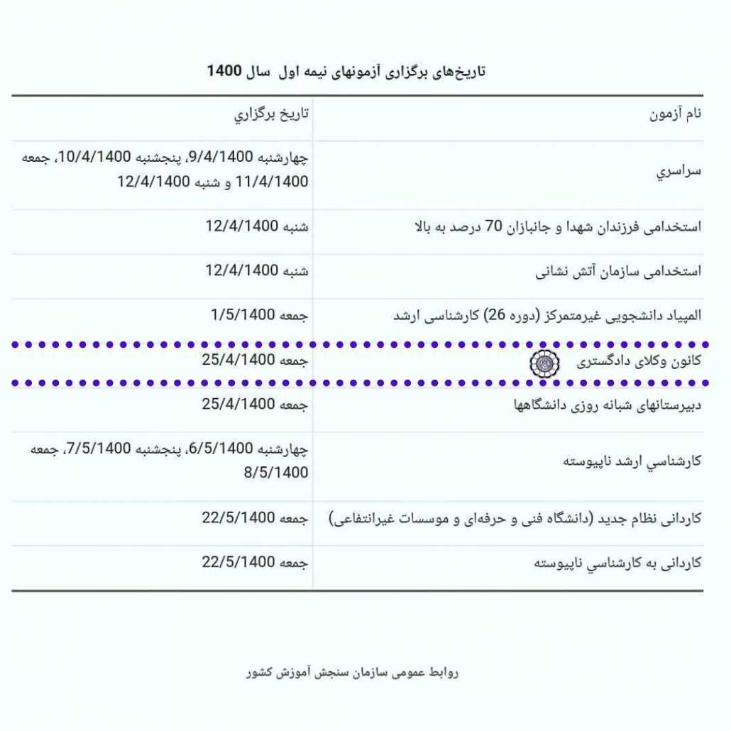 بنا بر اعلام روابط عمومی سازمان سنجش با مجوز ستاد ملی مقابله با ویروس کرونا، برنامه برگزاری آزمونهای سال ۱۴۰۰ طبق جدول فوق خواهد بود.