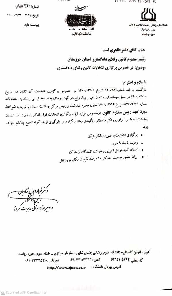 مکاتبه رئیس دانشگاه علوم پزشکی جندی شاپور اهواز در خصوص اعلام موارد پروتکلهای بهداشتی جهت برگزاری انتخابات هیات مدیره کانون وکلای دادگستری خوزستان در روز دهم تیرماه.