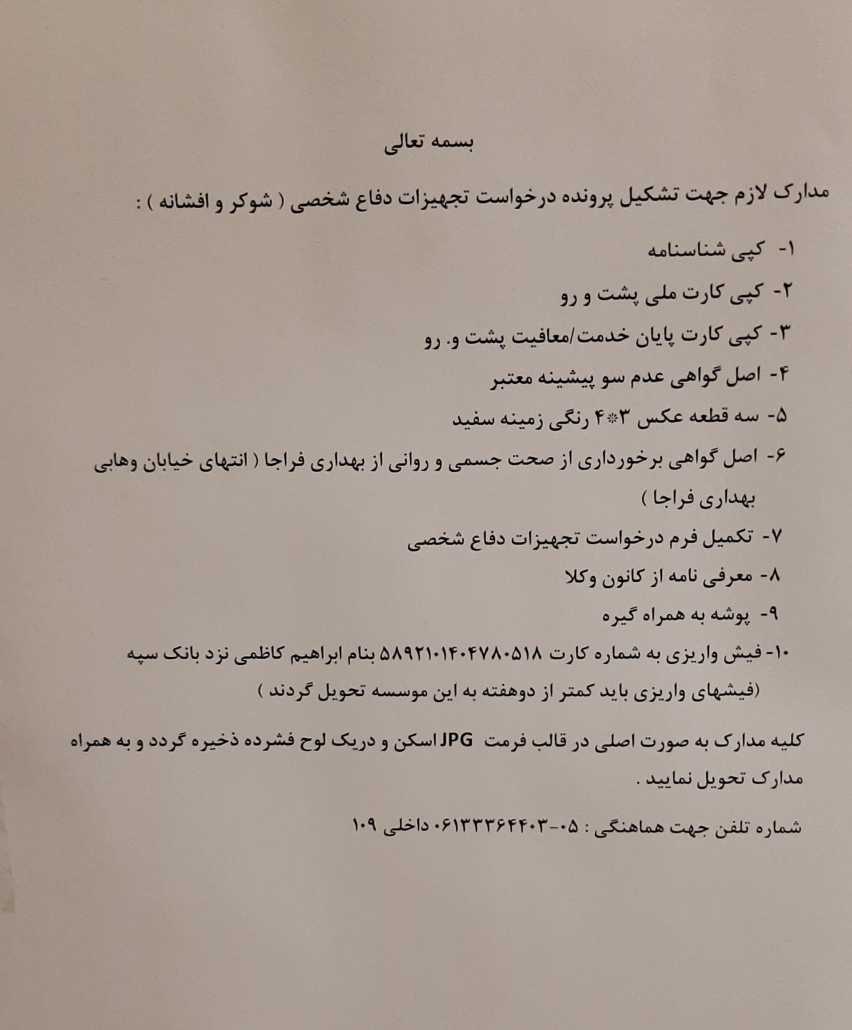 به اطلاع همکاران گرامی می رساند با پیگیری های بعمل آمده، مقدمات توزیع وسایل دفاع شخصی برای وکلای دادگستری فراهم گردیده است. کسانی که تقاضای اخذ تجهیزات را دارند جهت تشکیل پرونده روزهای زوج (شنبه،دوشنبه،چهارشنبه) از ساعت ۸:۳۰ الی ۱۲:۳۰ به کانون مراجعه نمایند.