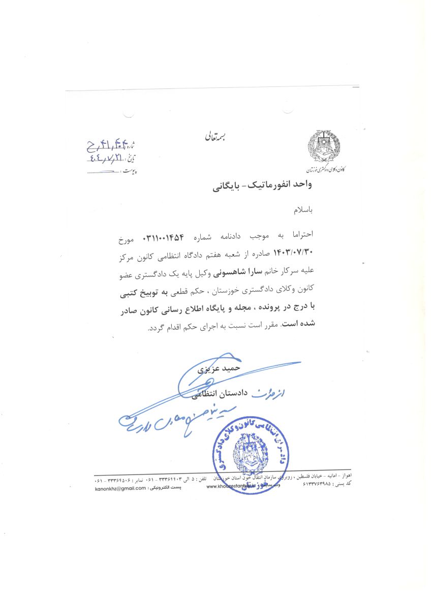 آرای انتظامی توبیخ کتبی و درج در پایگاه اطلاع رسانی سارا شاهسونی منتشر شده در کانون وکلای دادگستری استان خوزستان ۱۴۰۴/۰۸/۱۱ فعال ۱۴۰۴/۰۸/۱۱ ۰