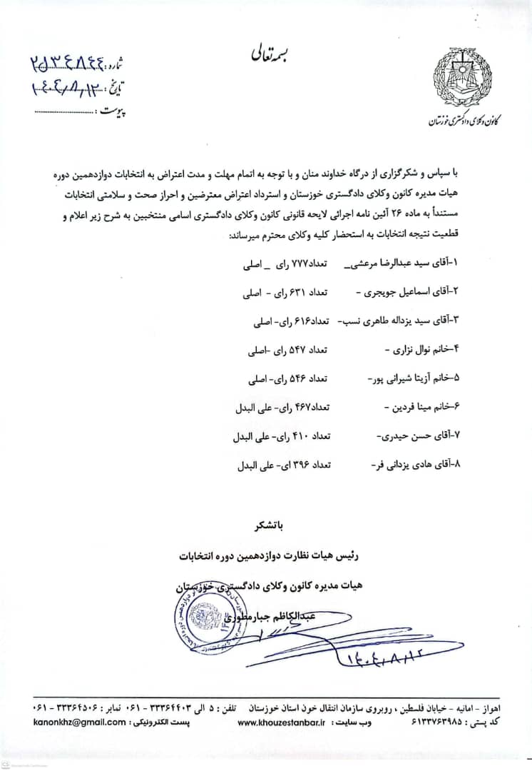 اخبار و اطلاعیه های هیات نظارت بر انتخابات هیات مدیره اعلام نتایج قطعی دوازدهمین دوره انتخابات هیات مدیره کانون وکلای دادگستری استان خوزستان منتشر شده در کانون وکلای دادگستری استان خوزستان ۱۴۰۴/۰۸/۱۲ فعال ۱۴۰۴/۰۸/۱۲ ۰