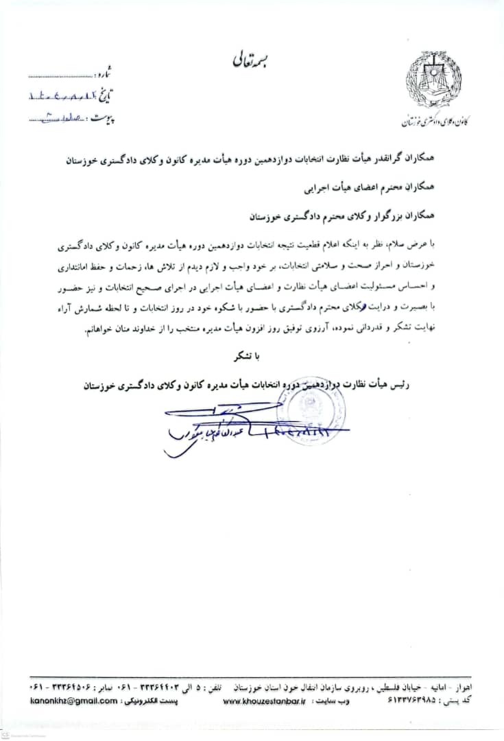 اخبار و اطلاعیه های هیات نظارت بر انتخابات هیات مدیره پیام تقدیر و تشکر رئیس هیات نظارت بر دوازدهمین دوره انتخابات هیات مدیره کانون وکلای دادگستری استان خوزستان منتشر شده در کانون وکلای دادگستری استان خوزستان ۱۴۰۴/۰۸/۱۲ فعال ۱۴۰۴/۰۸/۱۲ ۰