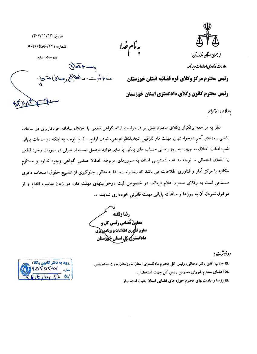 به اطلاع کلیه وکلای محترم عضو این کانون می رساند که مطابق نامه زیر تقدیم لوایح و دادخواست ها ی اعتراضی یا مواردی که دارای مهلت مشخص هستند را به روزهای پایانی مهلت موکول ننمایید . گواهی اختلال در سامانه عدل ایران دیگر برای وکلای عضو این کانون صادر نمی شود. مسئولیت عواقب و مشکلات احتمالی بر عهده خود وکلا می باشد و اثبات ایرادات و اختلالات سامانه کار شما را با مشکل مواجه می نماید .